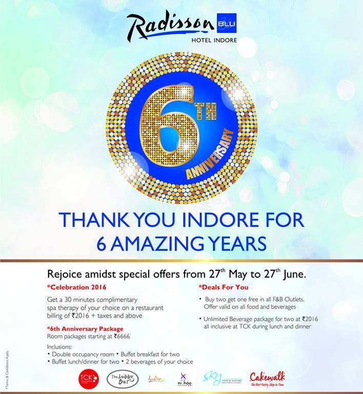 Hotel Radisson Blu, Indore celebrating 6th Anniversary a month long festivities and special offers and deals !!